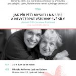 JAK PŘI PÉČI MYSLET I NA SEBE A NEVYČERPAT VŠECHNY SVÉ SÍLY PO 23. ZÁŘÍ 2019 od 18:00 hodin Přednáška je určena zejména pečujícím rodinám, které se starají o někoho blízkého s Alzheimerovou nemocí či jiným typem demence. Nabídne návodné rady a podněty, jak postupovat, kam se obrátit, co očekávat a kde hledat pomoc v …